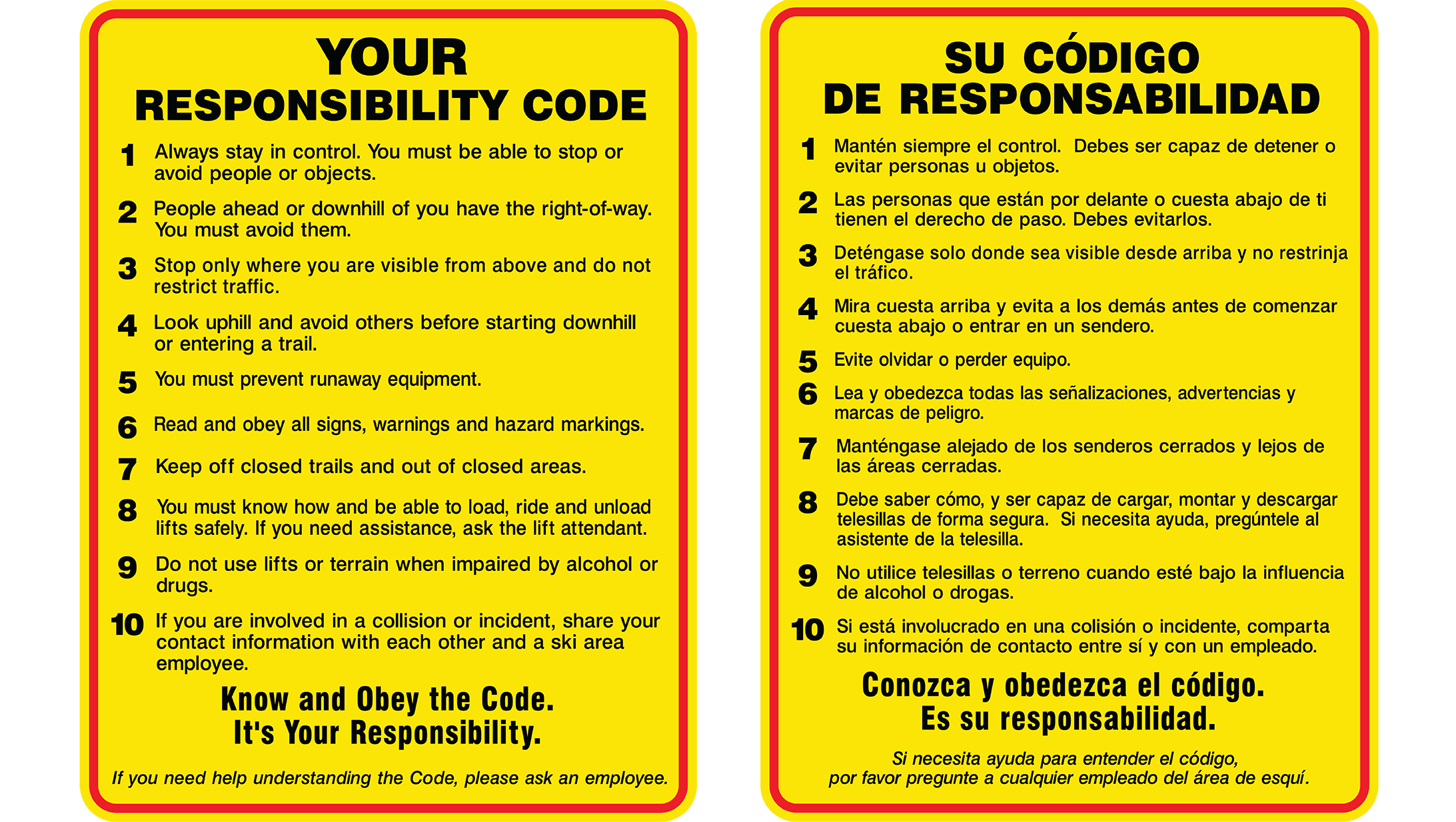 Winter sports involve risk of serious injury or death. Your knowledge, decisions and actions contribute to your safety and that of others. If you need help understanding the Code, please ask any ski area employee.
