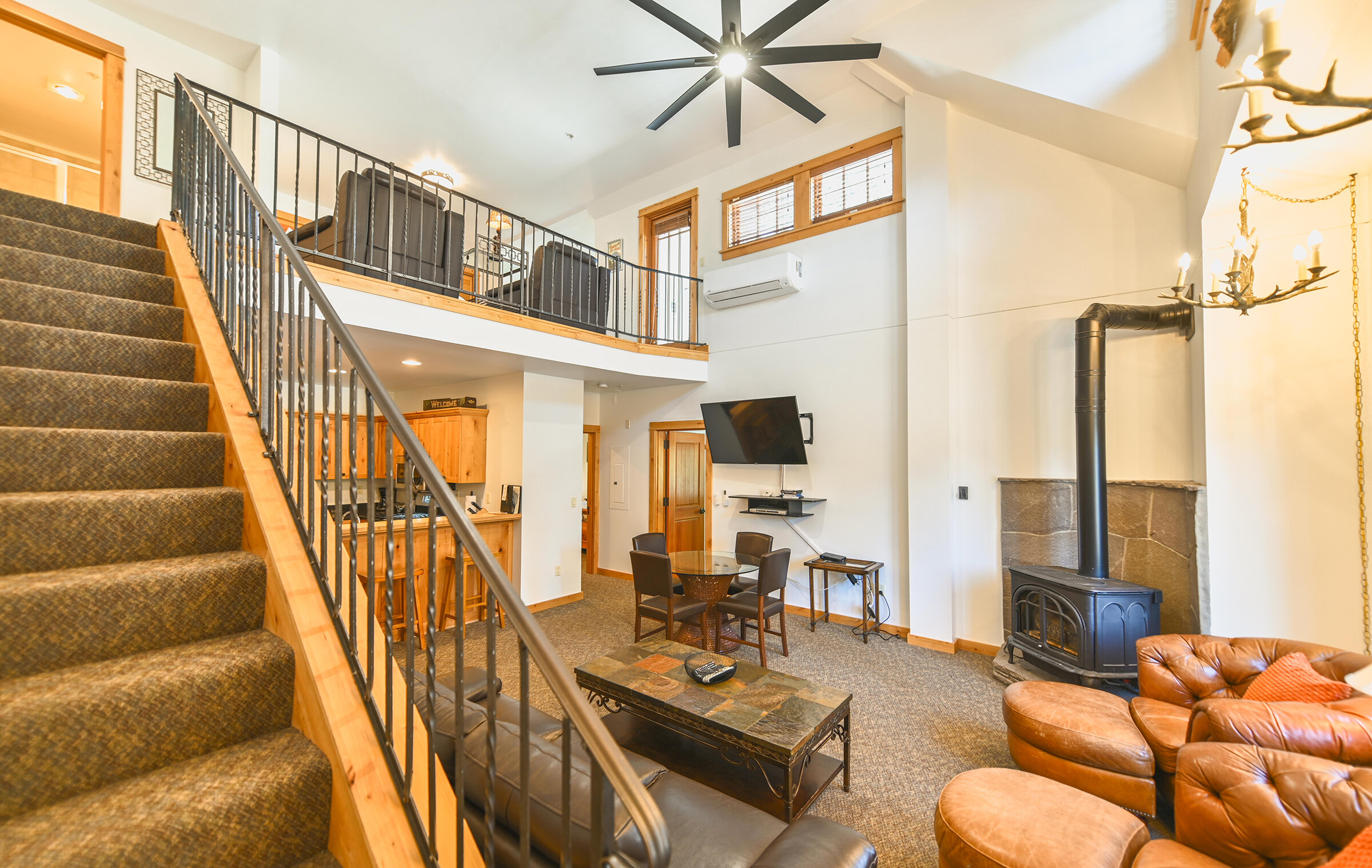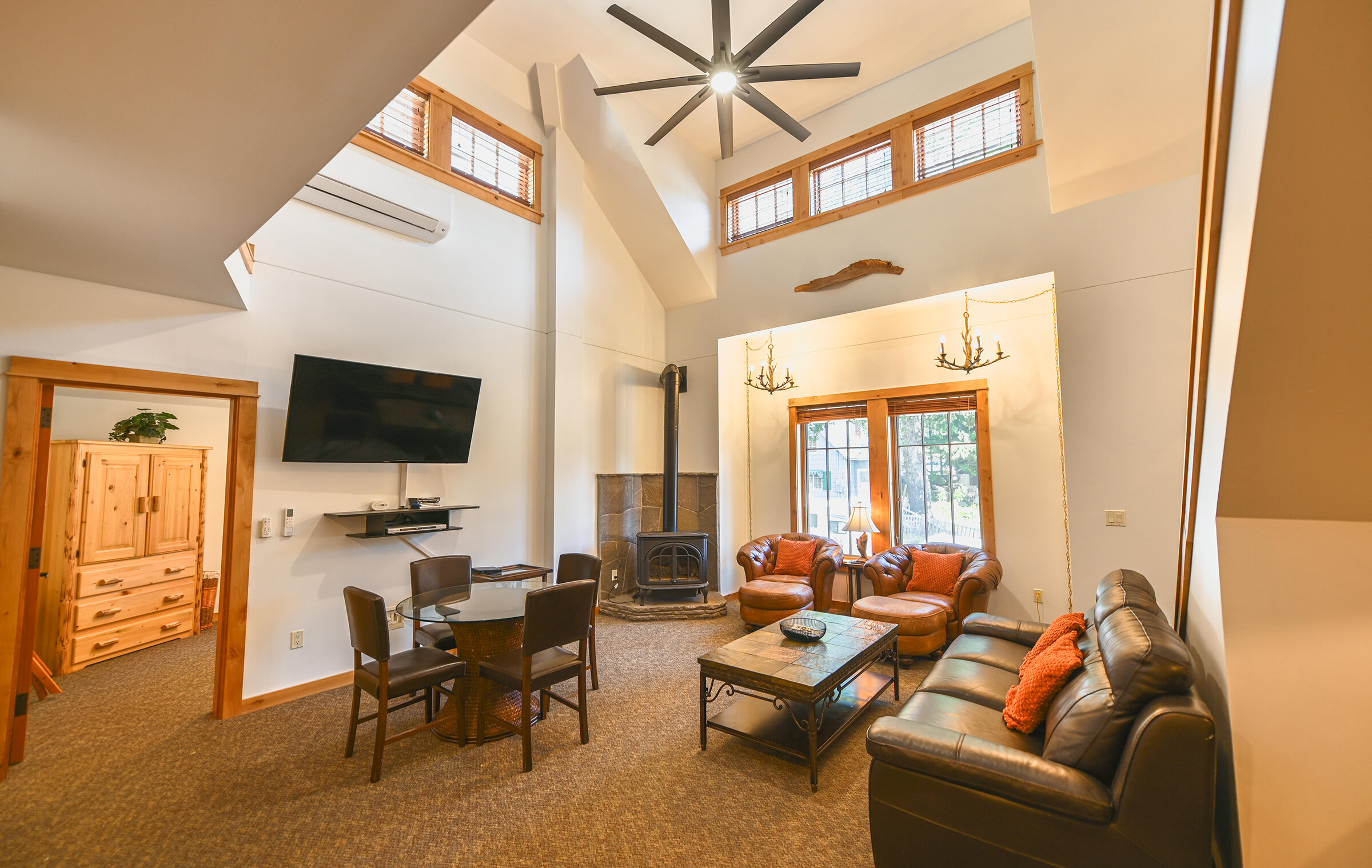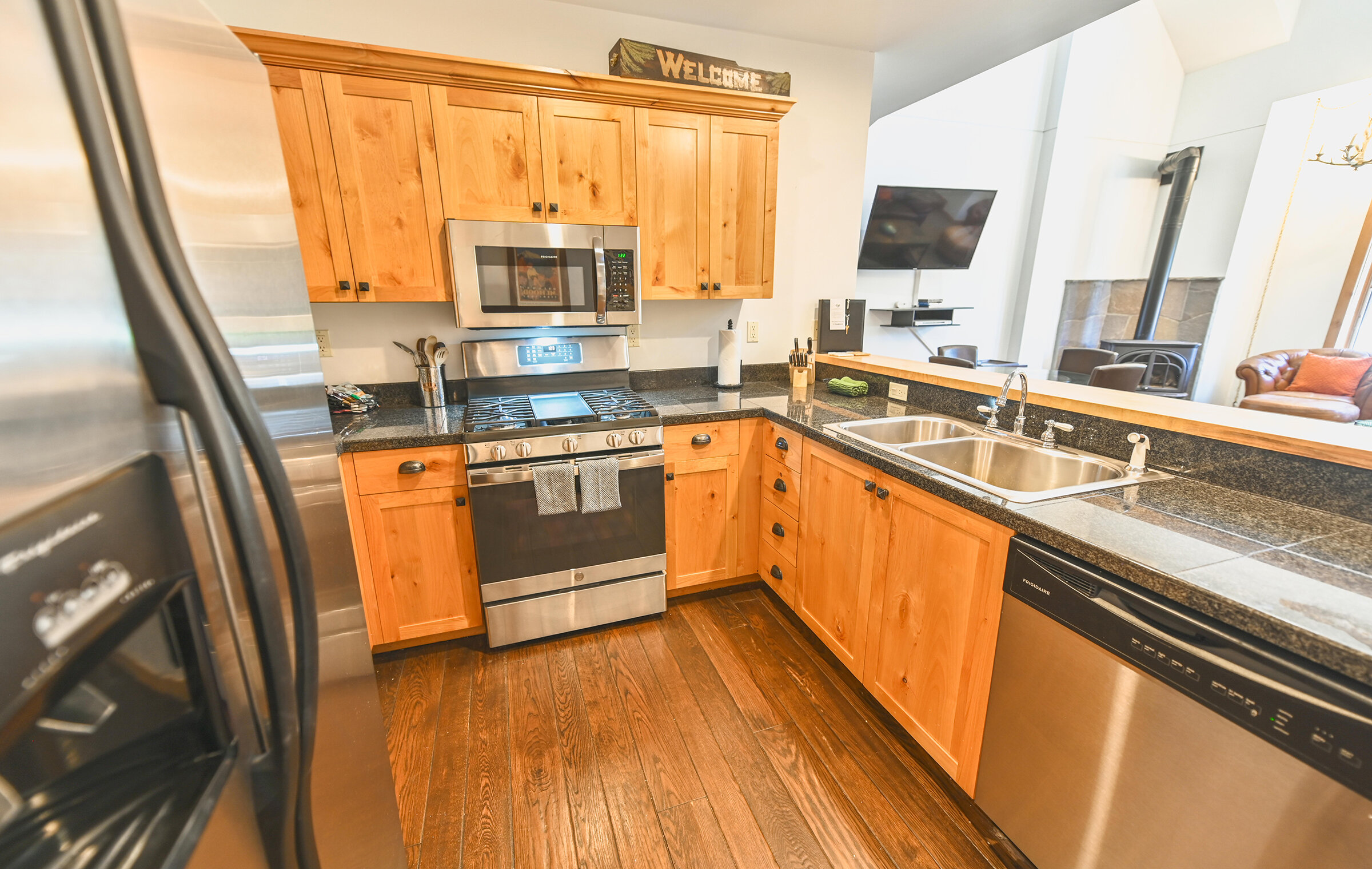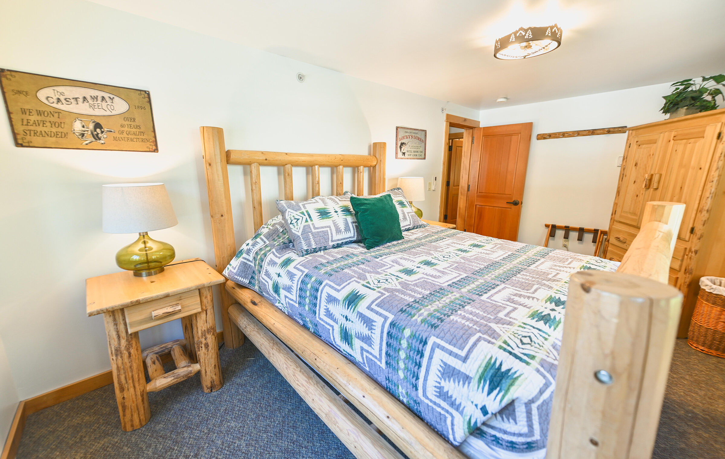 Spacious and inviting, Unit 8 offers the ambiance of a luxurious mountain cabin and the comforts of a boutique hotel suite. A comfy couch and fireplace with adjacent kitchen makes for the perfect space to entertain. Lodge-inspired design is featured throughout spacious Unit 8, with over-sized knotty pine furniture in the bedrooms.