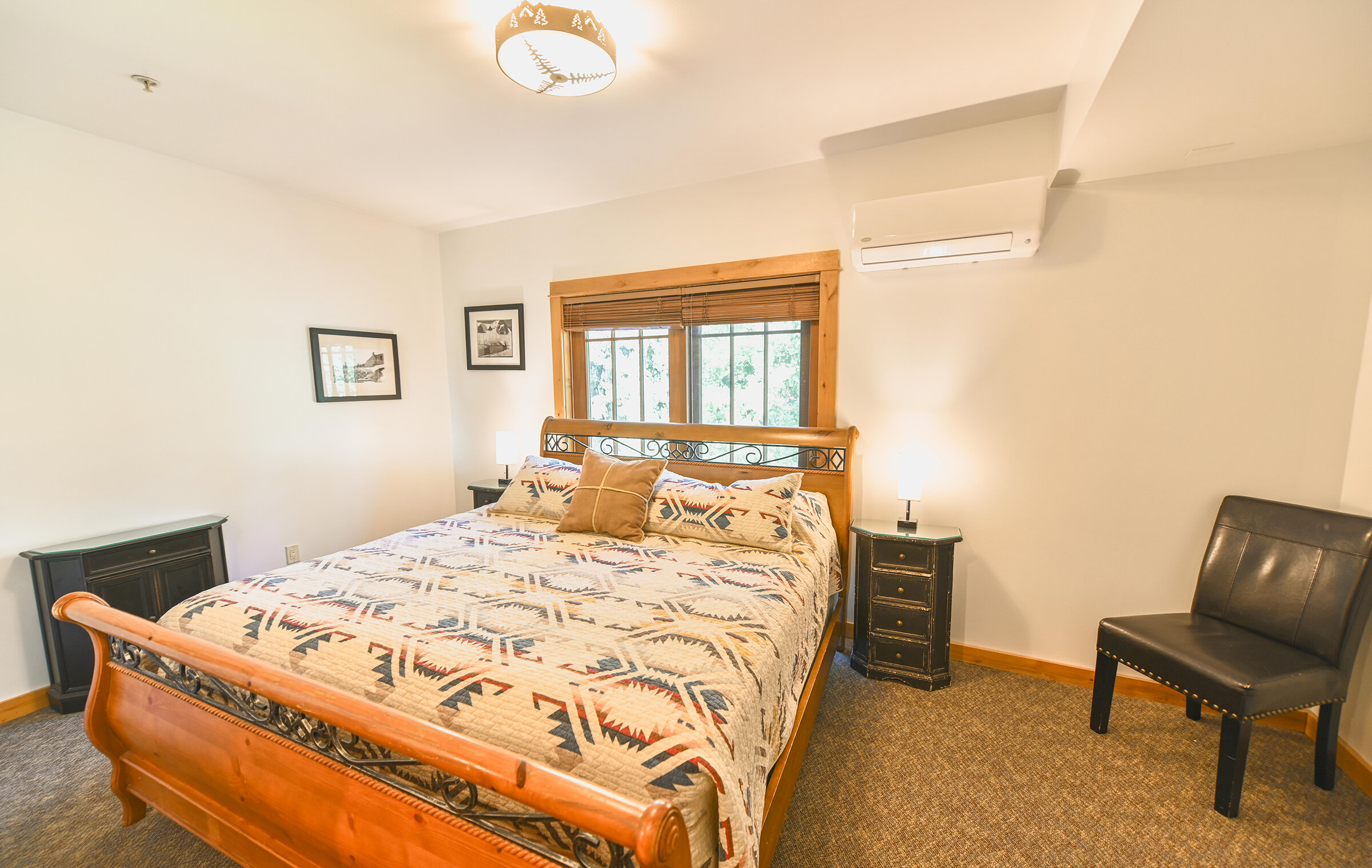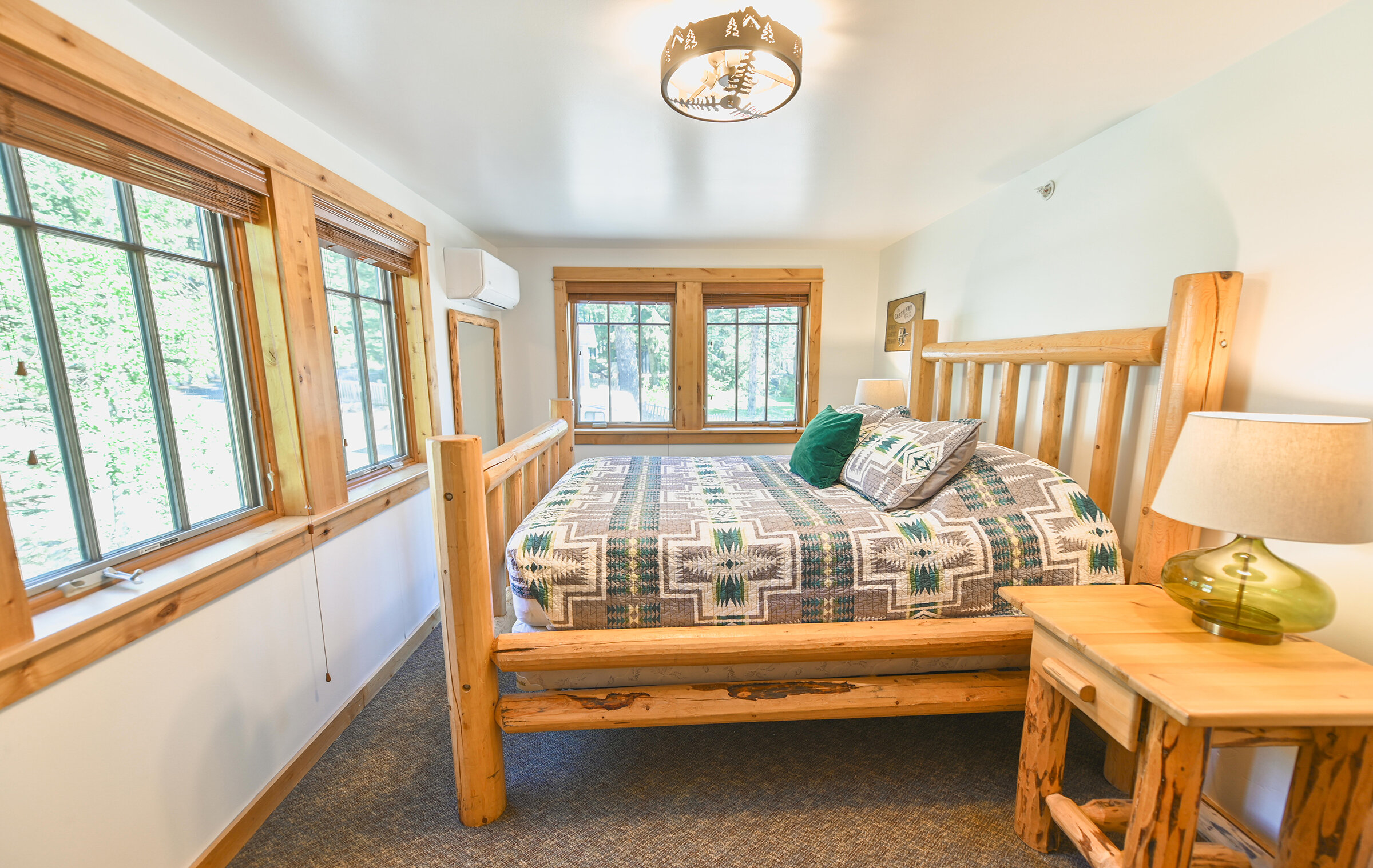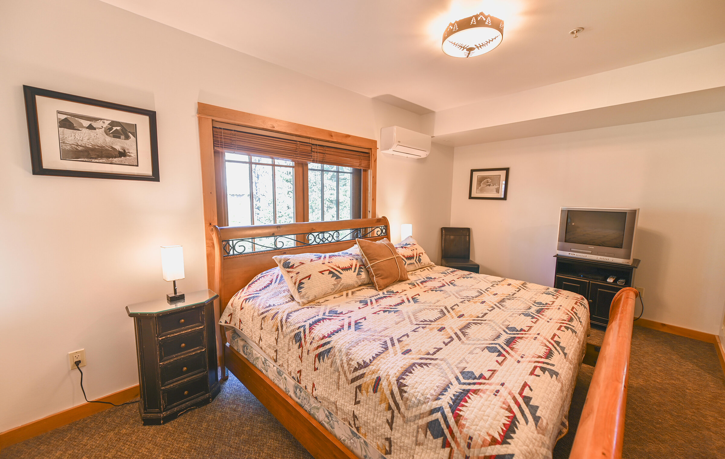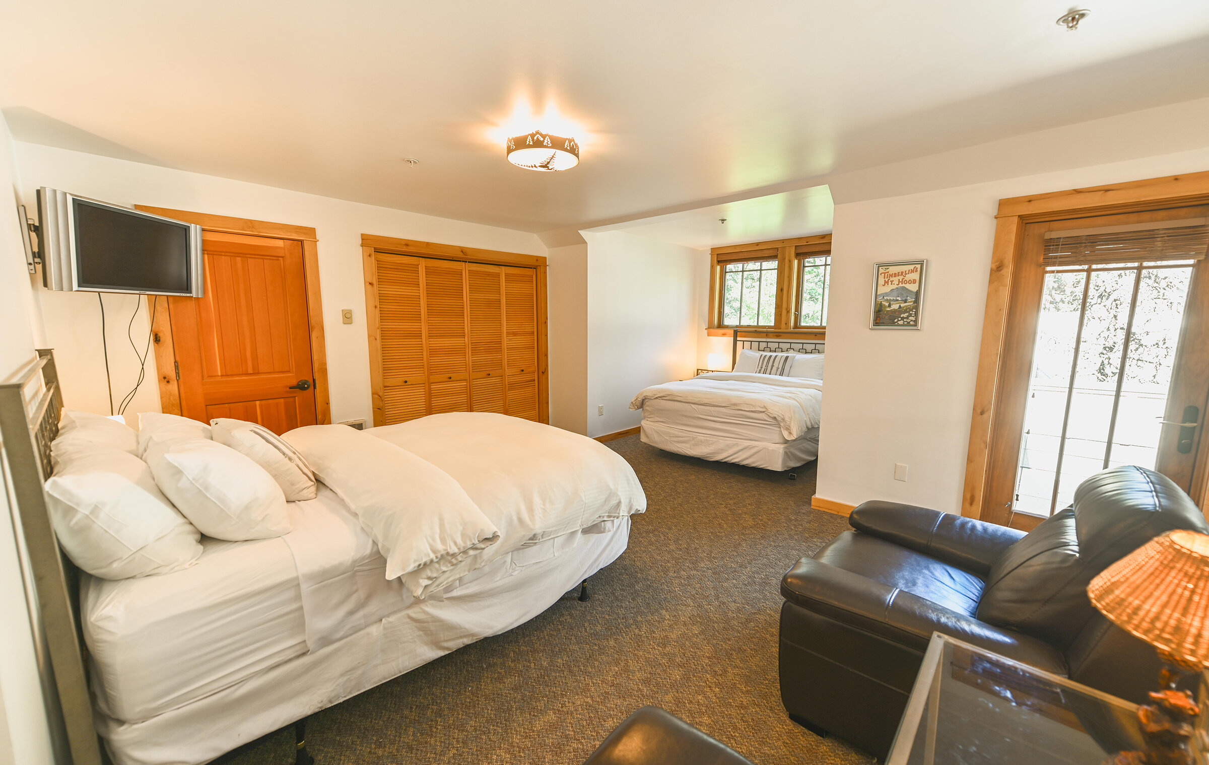 Spacious and inviting, Unit 8 offers the ambiance of a luxurious mountain cabin and the comforts of a boutique hotel suite. A comfy couch and fireplace with adjacent kitchen makes for the perfect space to entertain. Lodge-inspired design is featured throughout spacious Unit 8, with over-sized knotty pine furniture in the bedrooms.