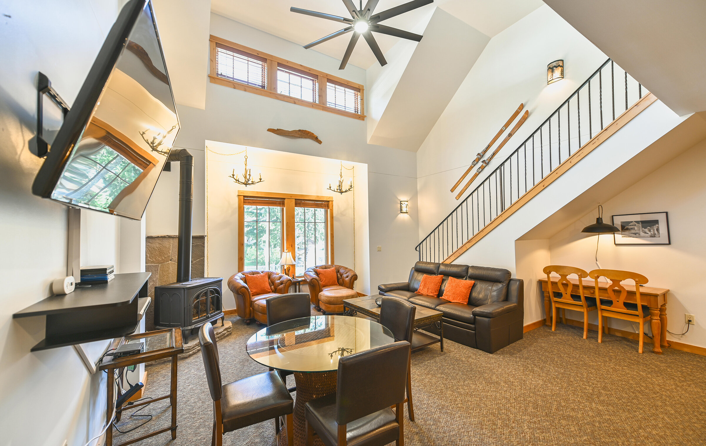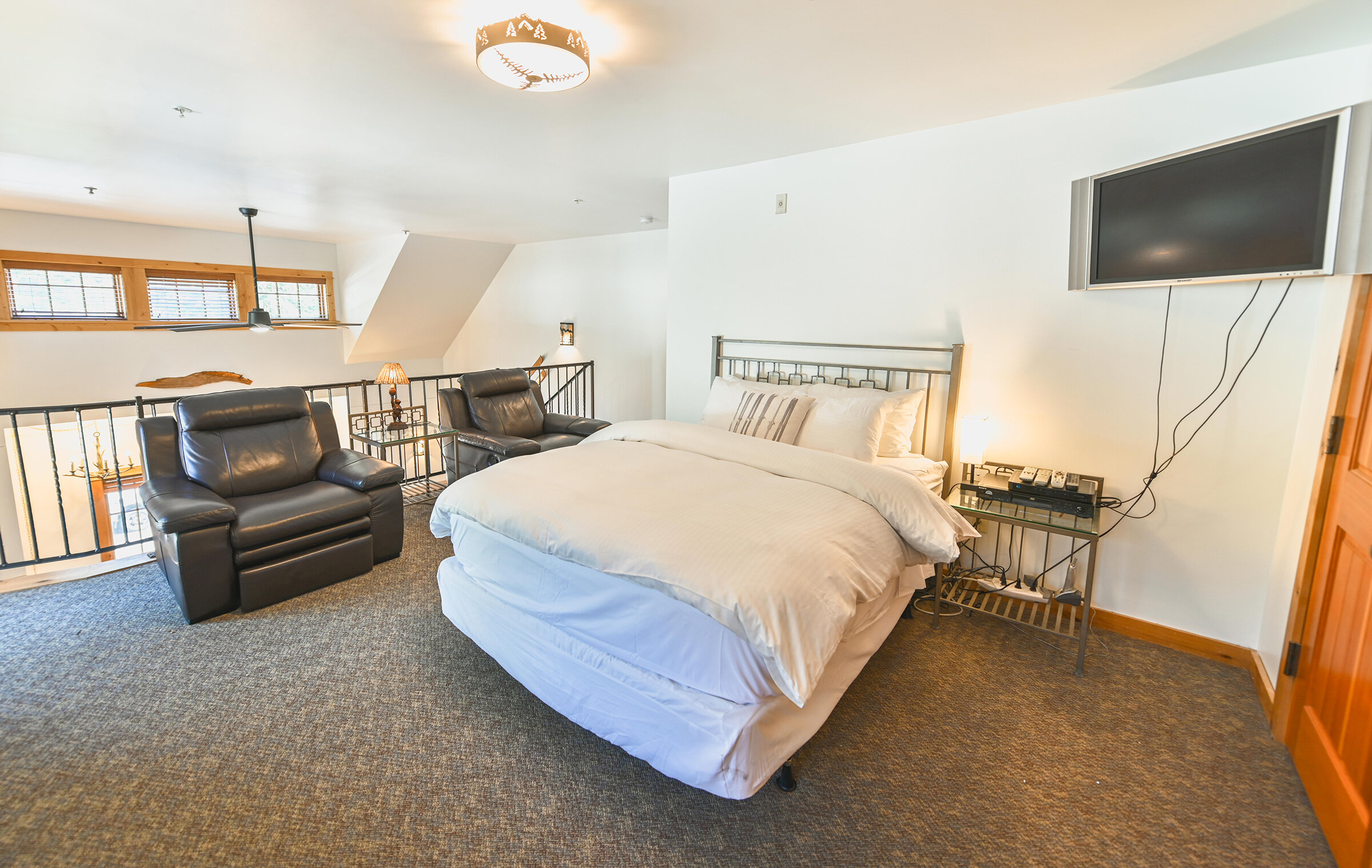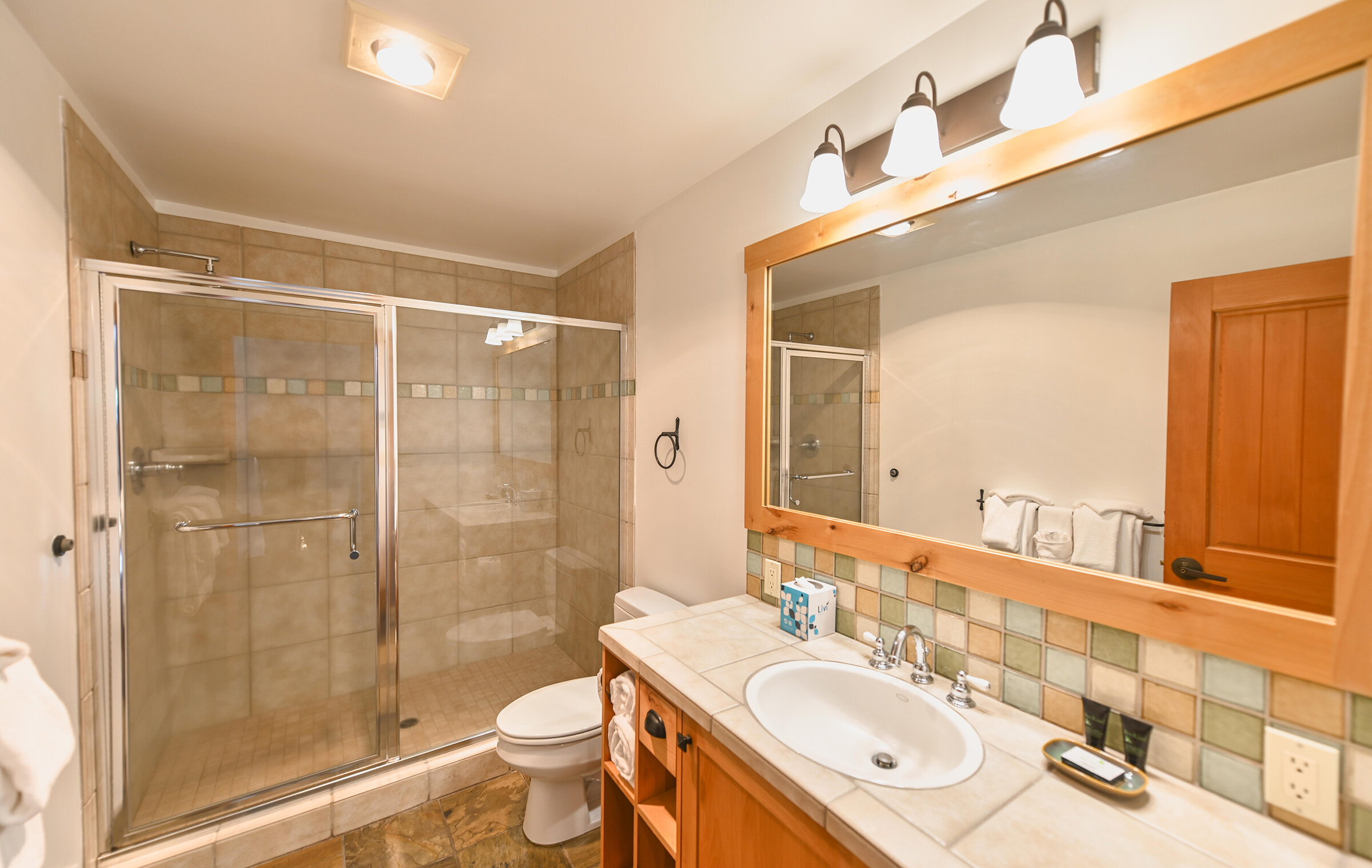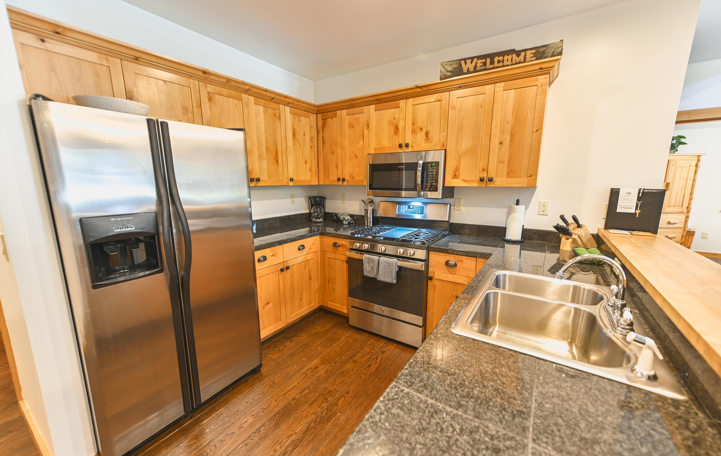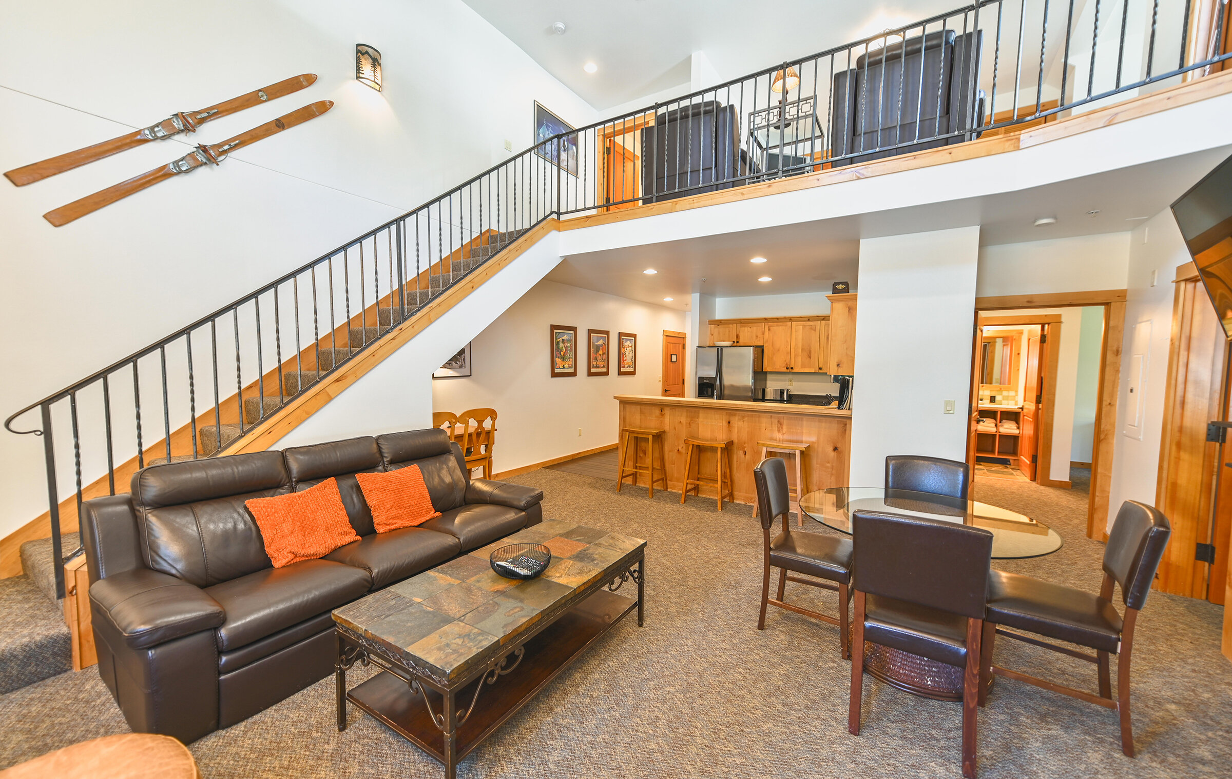 Spacious and inviting, Unit 8 offers the ambiance of a luxurious mountain cabin and the comforts of a boutique hotel suite. A comfy couch and fireplace with adjacent kitchen makes for the perfect space to entertain. Lodge-inspired design is featured throughout spacious Unit 8, with over-sized knotty pine furniture in the bedrooms.