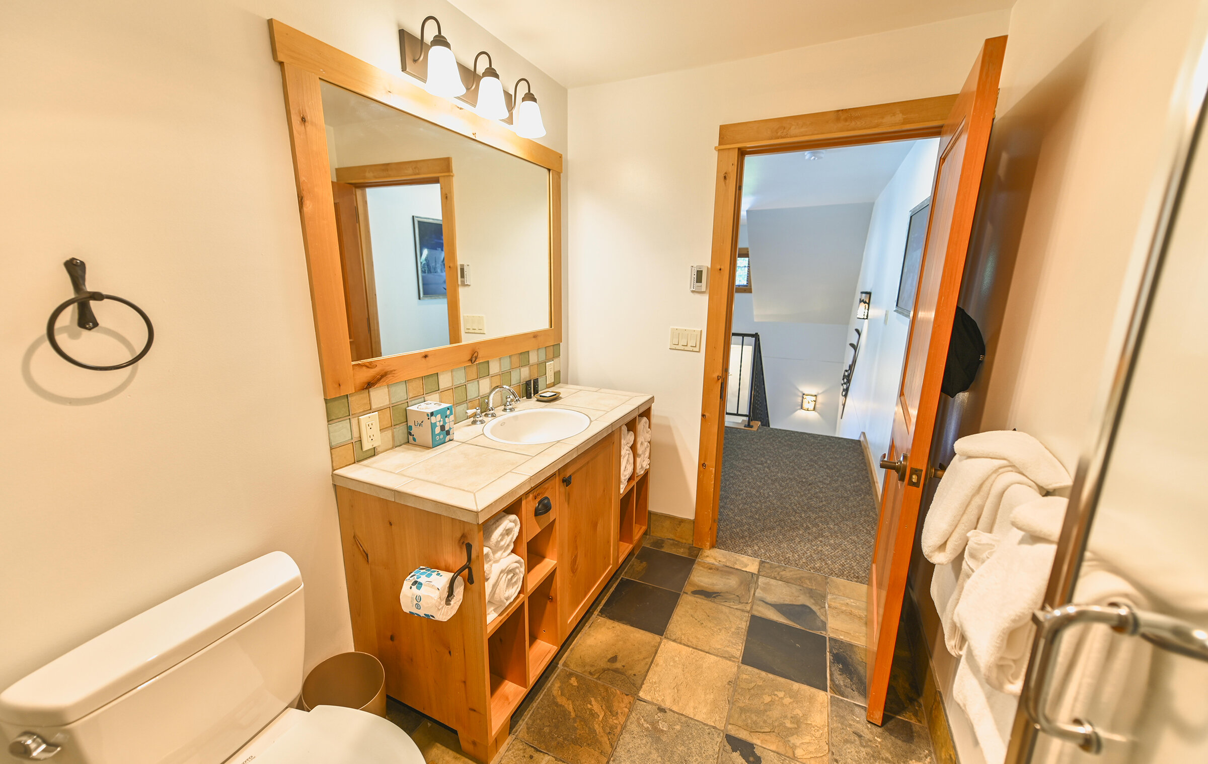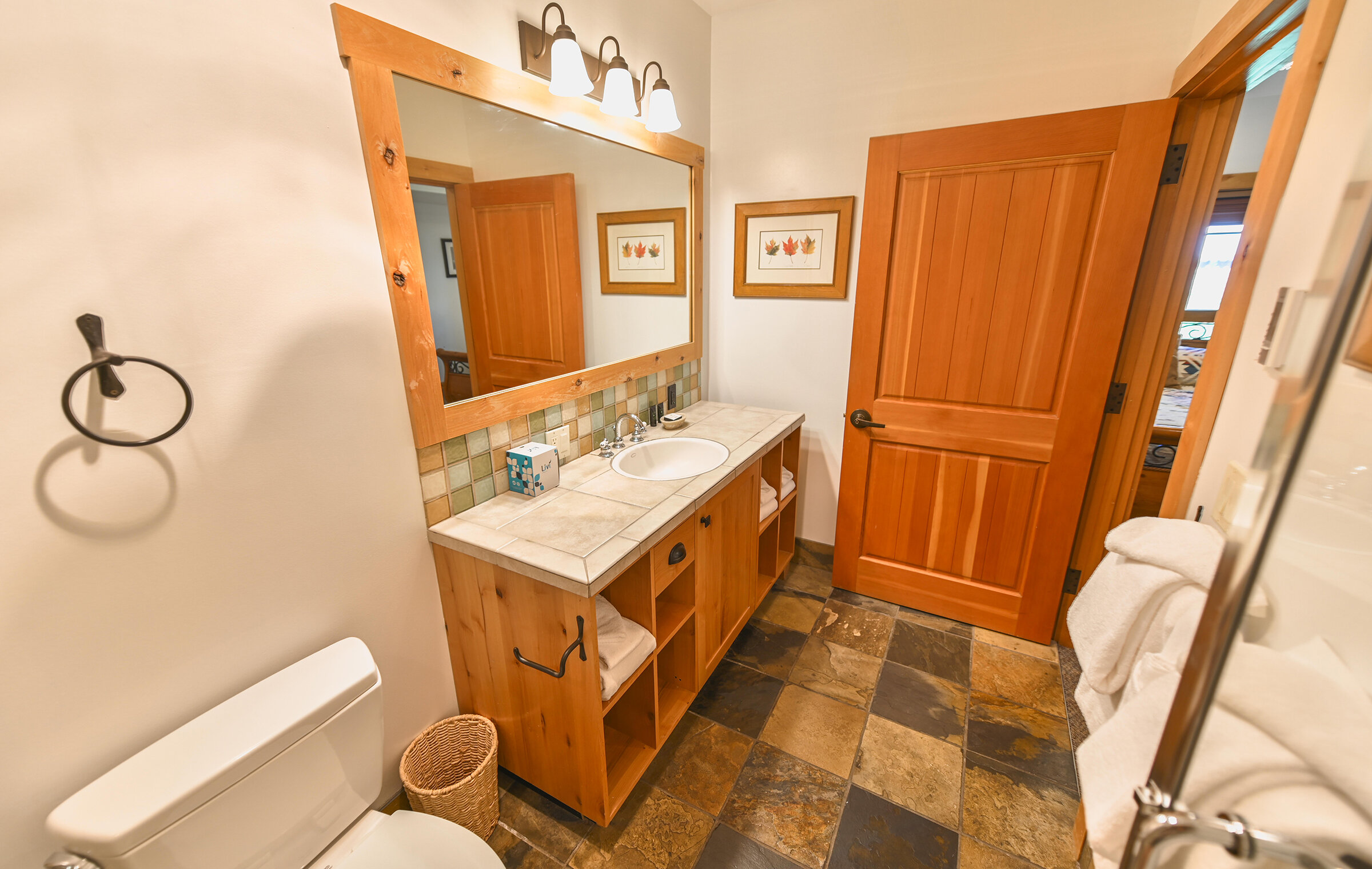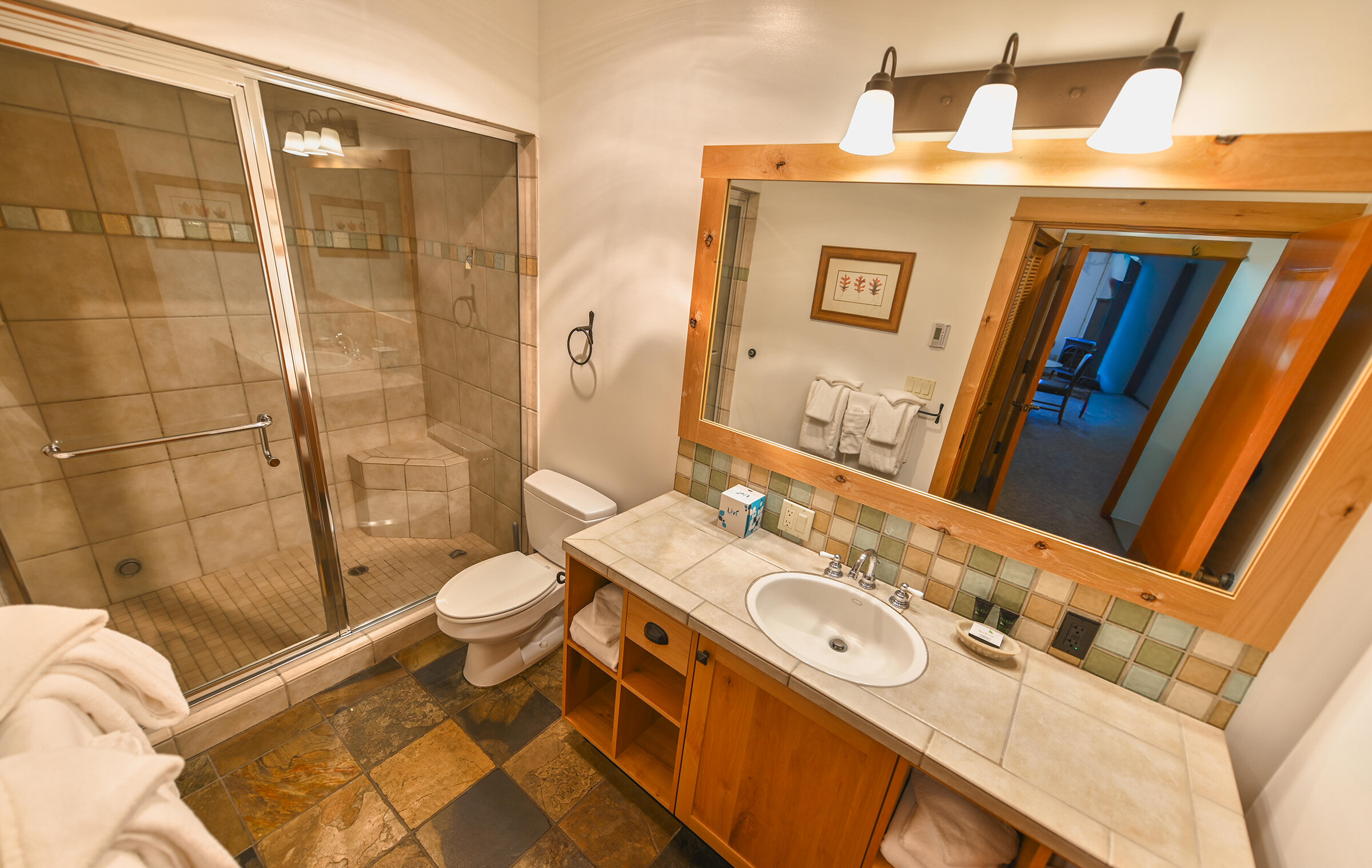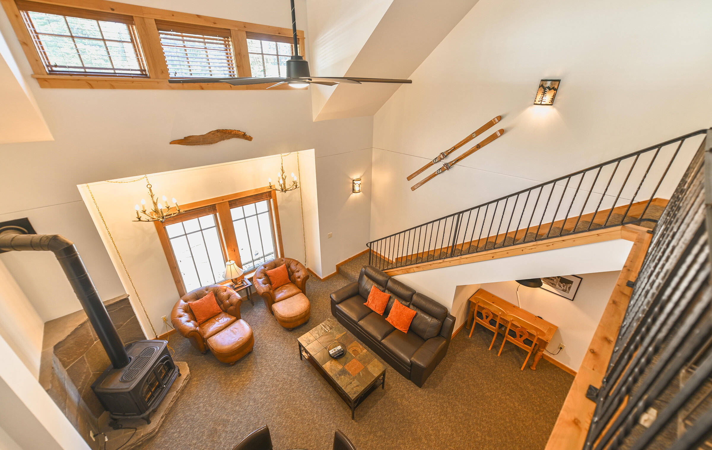 Spacious and inviting, Unit 8 offers the ambiance of a luxurious mountain cabin and the comforts of a boutique hotel suite. A comfy couch and fireplace with adjacent kitchen makes for the perfect space to entertain. Lodge-inspired design is featured throughout spacious Unit 8, with over-sized knotty pine furniture in the bedrooms.